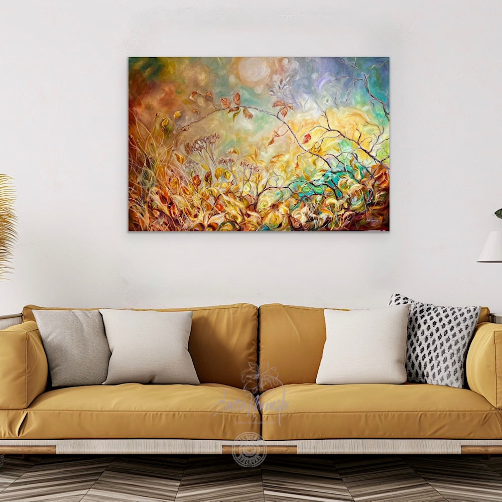 My response was to instantly start on this huge canvas to immortalise that little patch of Nature, which I found so inspiring. In the morning the sun would hazily glow through the distant trees & illuminate each blade of grass & golden leaf. In the evening the sunset would make it come alive with golden light.