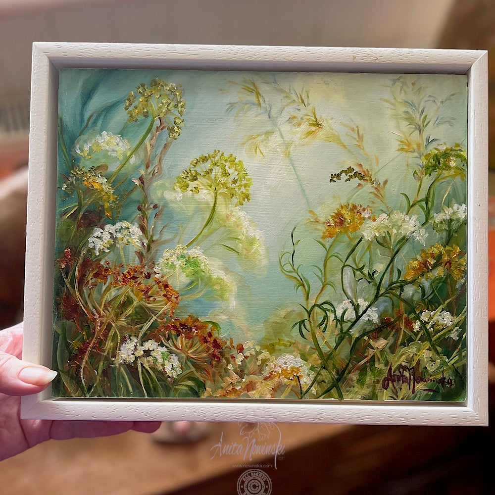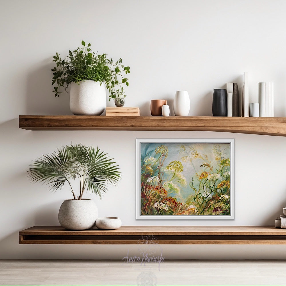 This serene artwork captures the delicate beauty of a wild flower meadow, where graceful cow parsley and native grasses sway beneath a soft, misty sky. The muted blue-grey tones evoke tranquility, inviting contemplation and calm into your space.